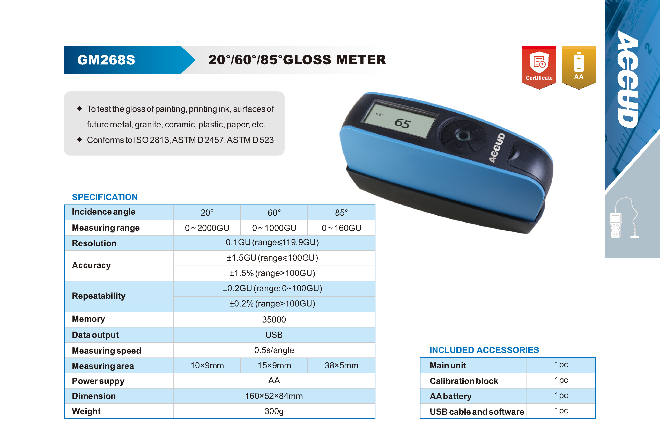 future metal, granite, ceramic, plastic, paper, etc. ■ Conforms to ISO 2813, ASTM D 2457, ASTM D 523