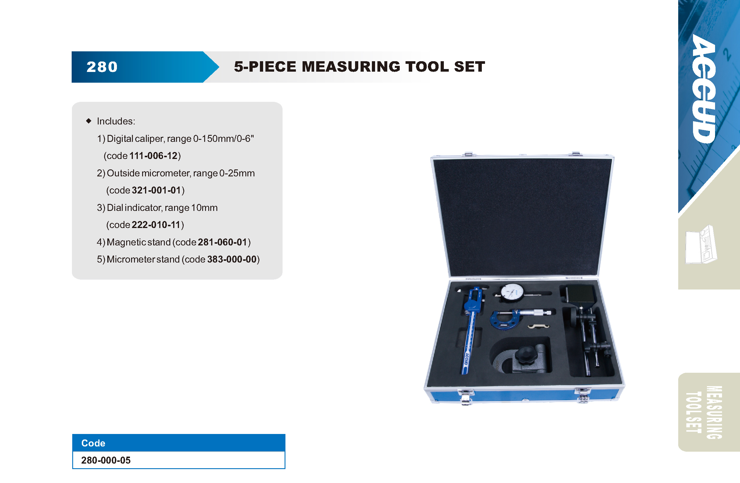 1) Digital caliper, range 0-150mm/0-6″ (code 111-006-12) 2) Outside micrometer, range 0-25mm (code 321-001-01) 3) Dial indicator, range 10mm (code 222-010-11) 4) Magnetic stand (code 281-060-01) 5) Micrometer stand (code 383-000-00)