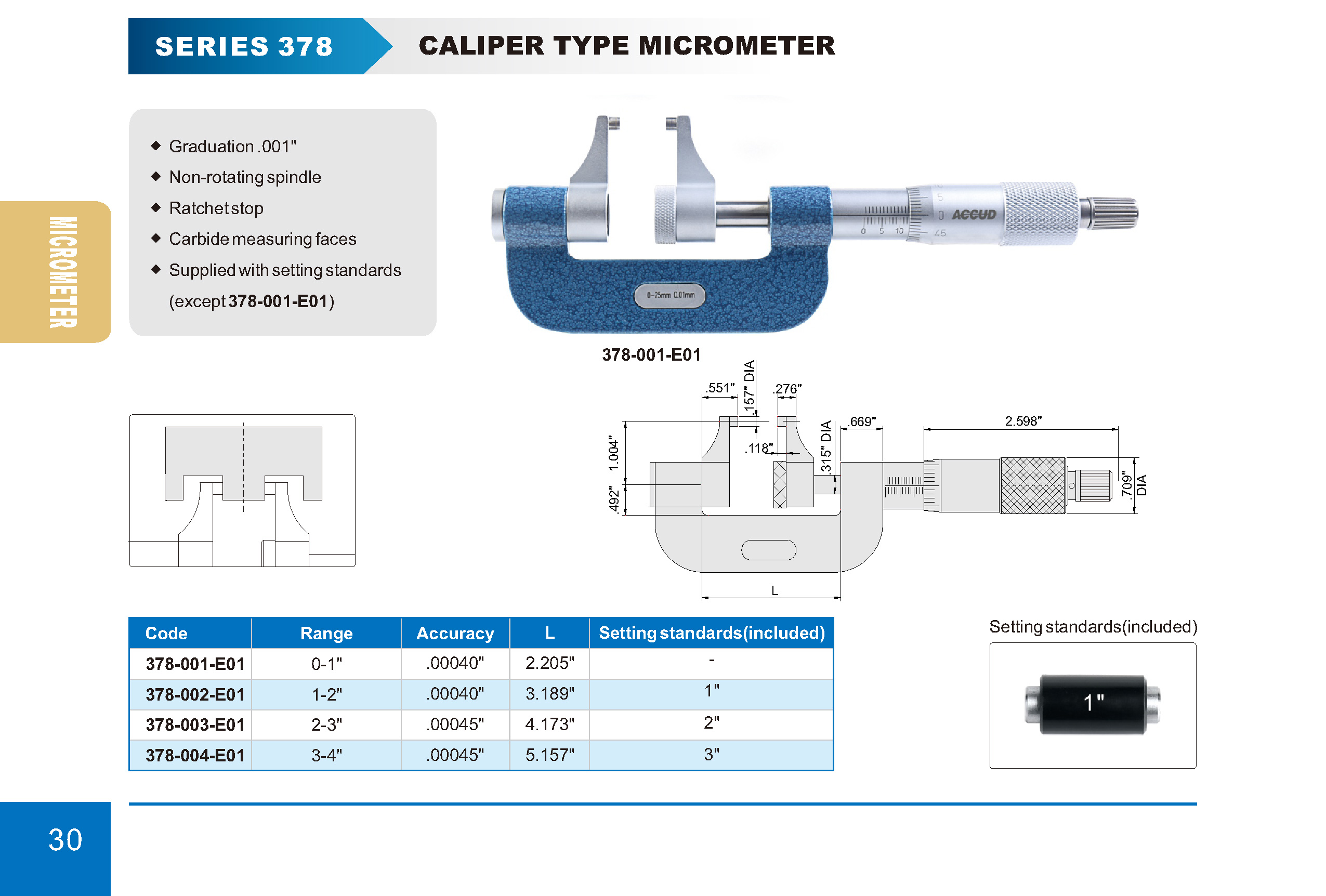 ■ Graduation .001″ ■ Non-rotating spindle ■ Ratchet stop ■ Carbide measuring faces ■ Supplied with setting standards (except 378-001-E01)