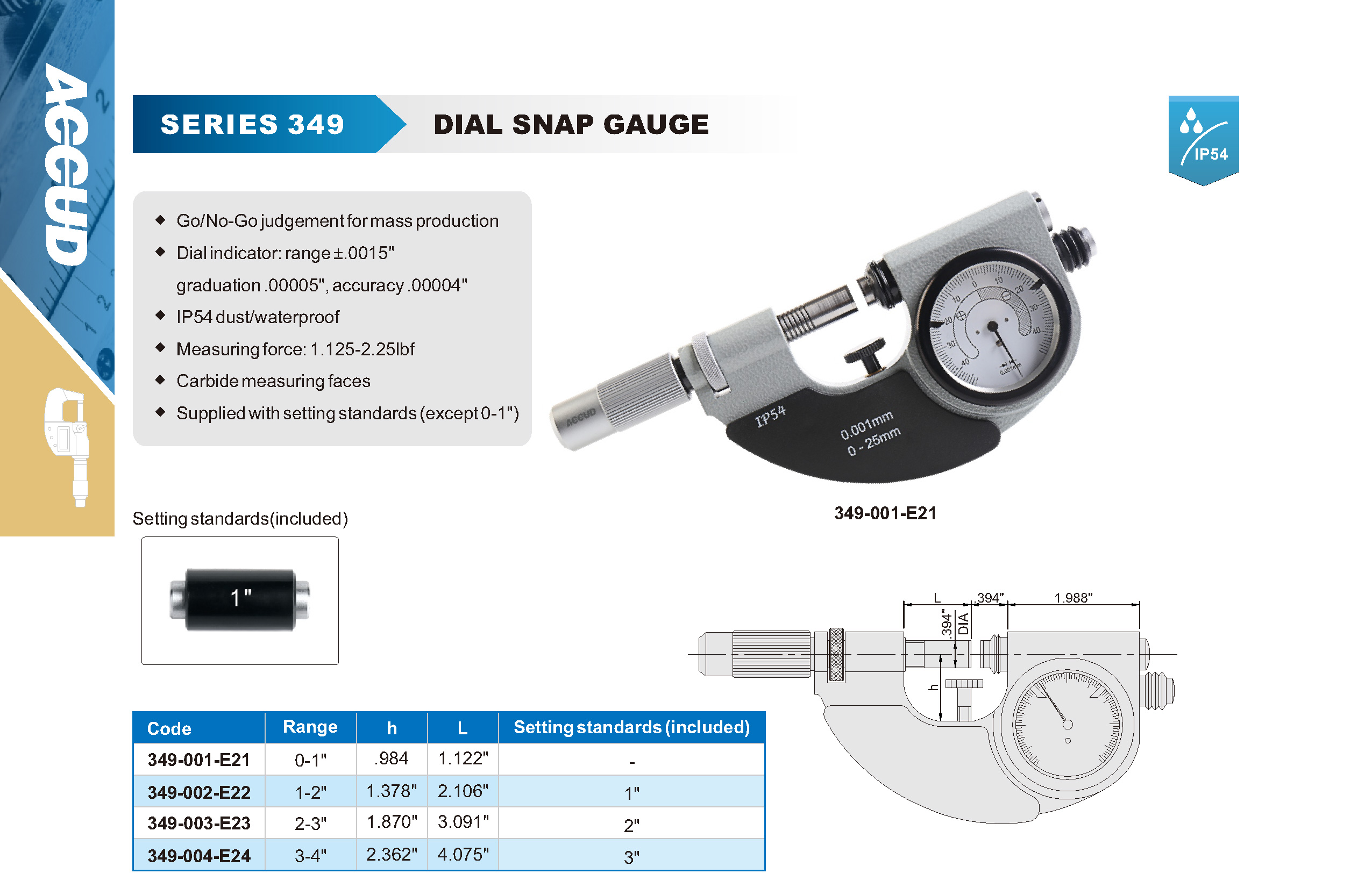 ■ Go/No-Go judgement for mass production ■ Dial indicator: range ±.0015″ graduation .00005″, accuracy .00004″ ■ IP54 dust/waterproof ■ Measuring force: 1.125-2.25lbf ■ Carbide measuring faces ■ Supplied with setting standards (except 0-1″)