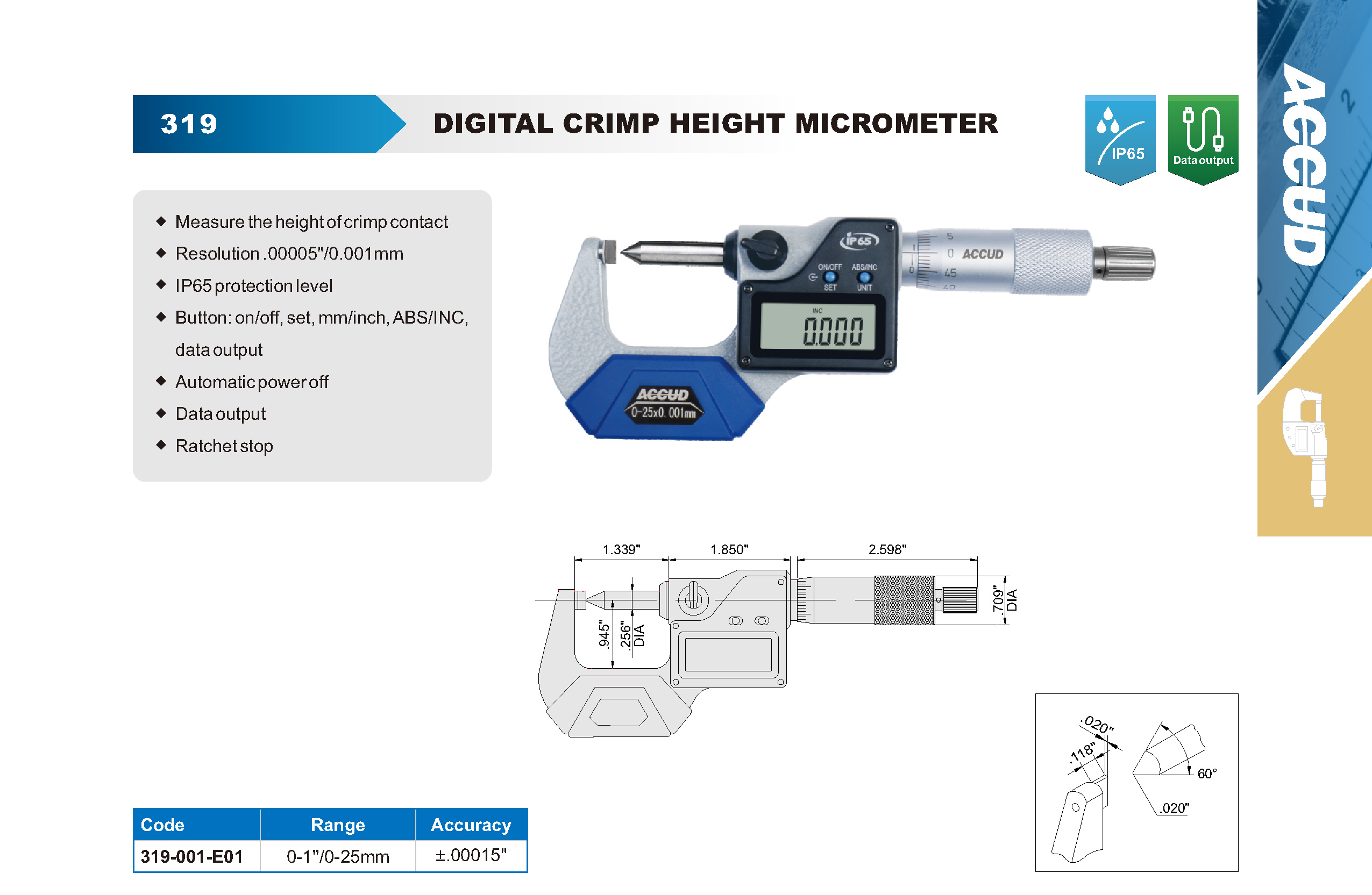 ■ Measure the height of crimp contact ■ Resolution .00005″/0.001mm ■ IP65 protection level ■ Button: on/off, set, mm/inch, ABS/INC, data output ■ Automatic power off ■ Data output ■ Ratchet stop