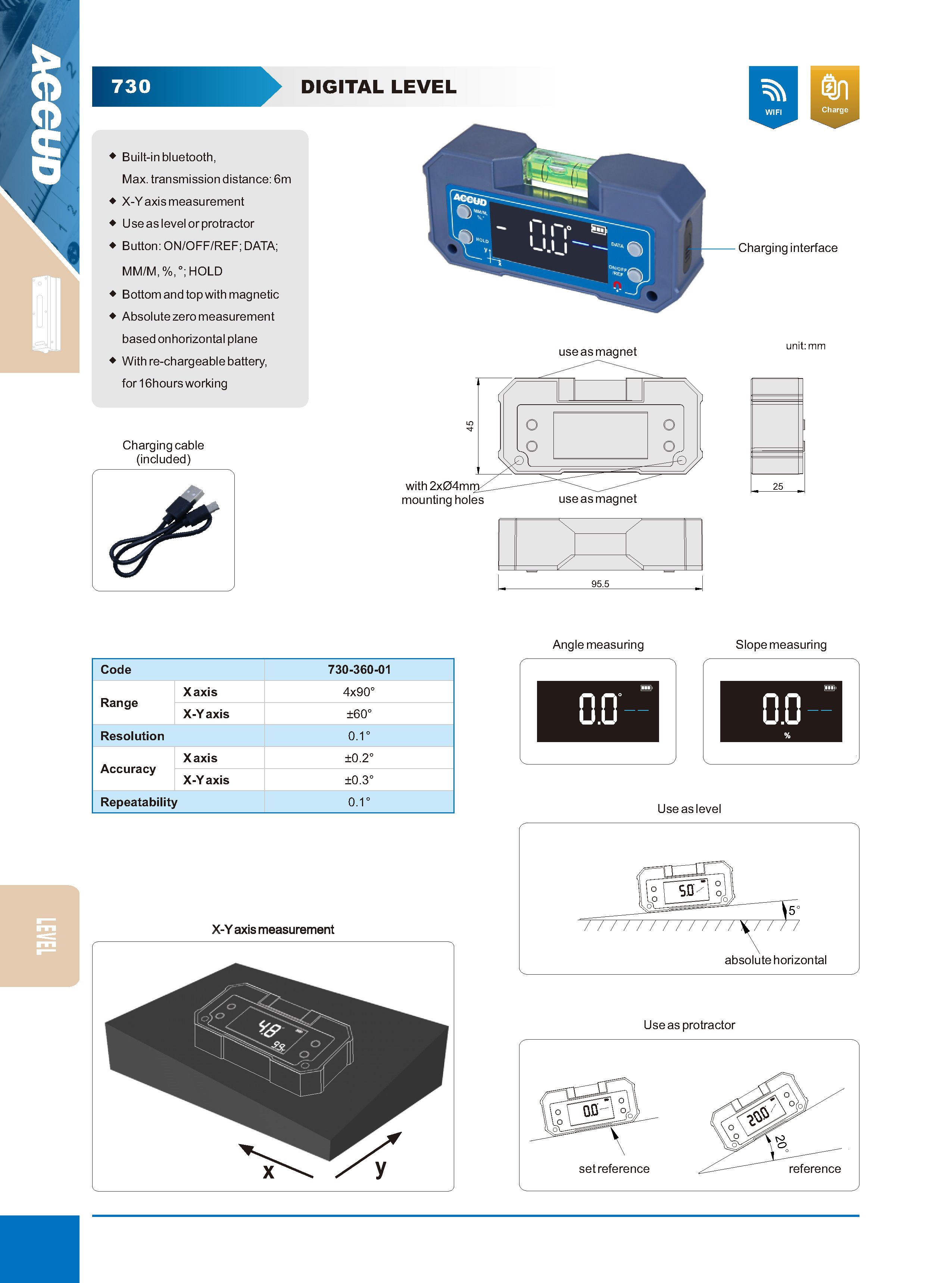 ■ X-Y axis measurement ■ Use as level or protractor ■ Button: ON/OFF/REF; DATA; MM/M, %, °; HOLD ■ Bottom and top with magnetic ■ Absolute zero measurement based onhorizontal plane ■ With re-chargeable battery, for 16hours working