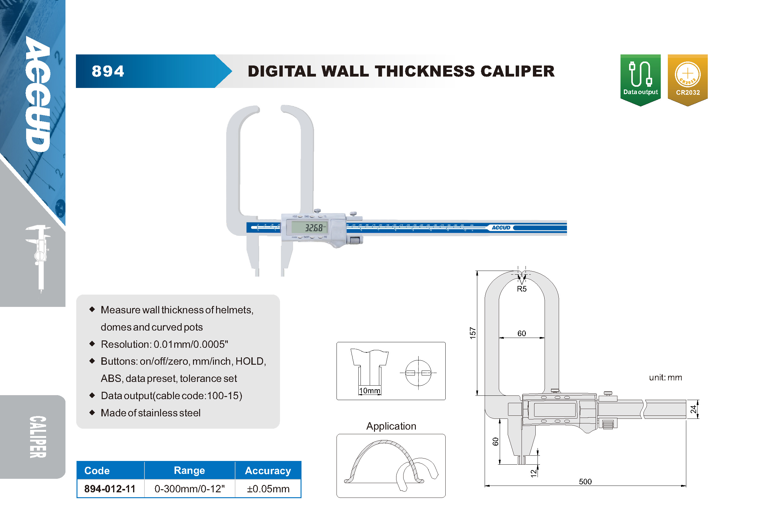 domes and curved pots ■ Resolution: 0.01mm/0.0005″ ■ Buttons: on/off/zero, mm/inch, HOLD, ABS, data preset, tolerance set ■ Data output(cable code:100-15) ■ Made of stainless steel