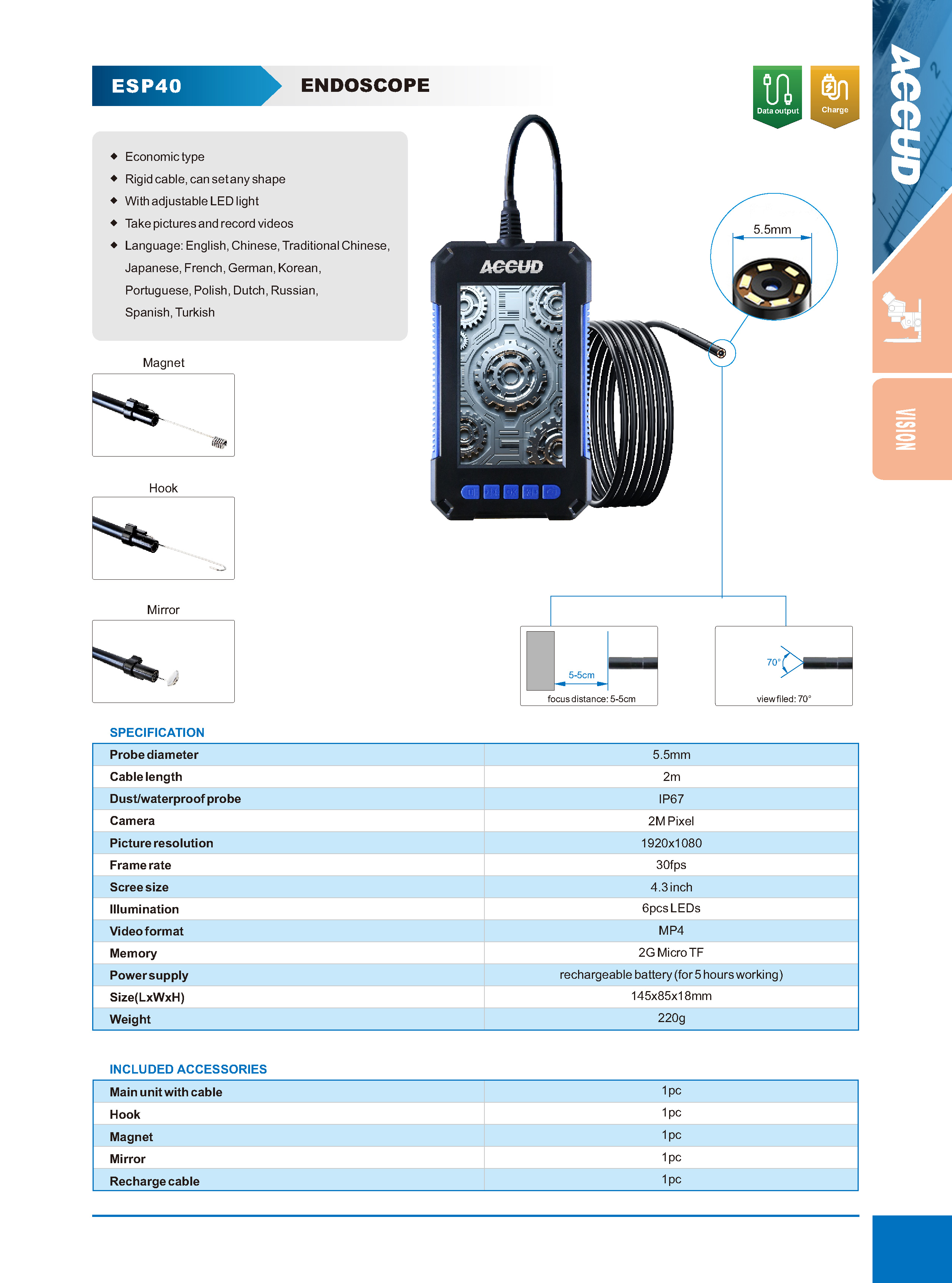 ■ Economic type ■ Rigid cable, can set any shape ■ With adjustable LED light ■ Take pictures and record videos ■ Language: English, Chinese, Traditional Chinese, Japanese, French, German, Korean, Portuguese, Polish, Dutch, Russian, Spanish, Turkish