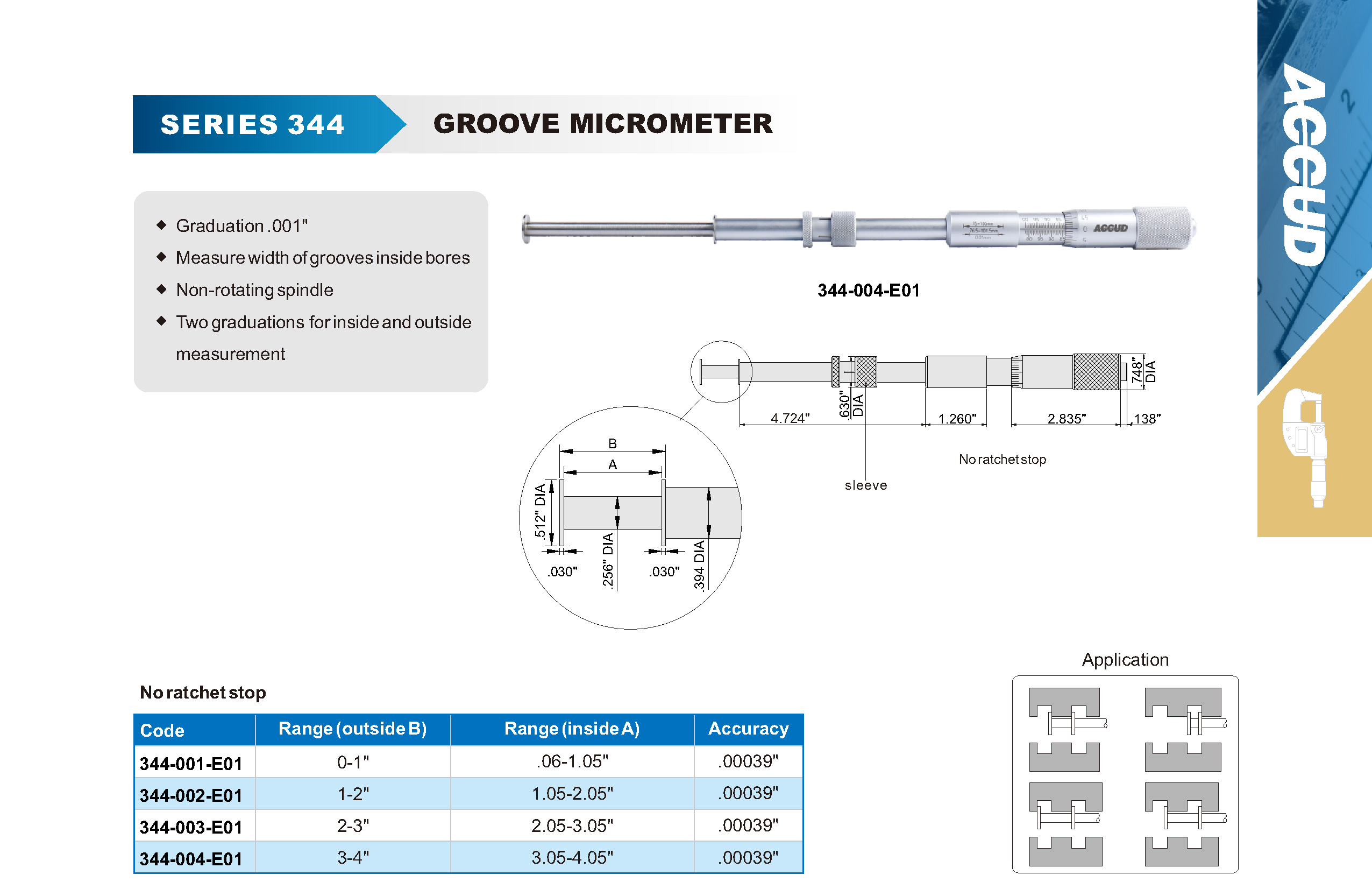 ■ Graduation .001″ ■ Measure width of grooves inside bores ■ Non-rotating spindle ■ Two graduations for inside and outside measurement