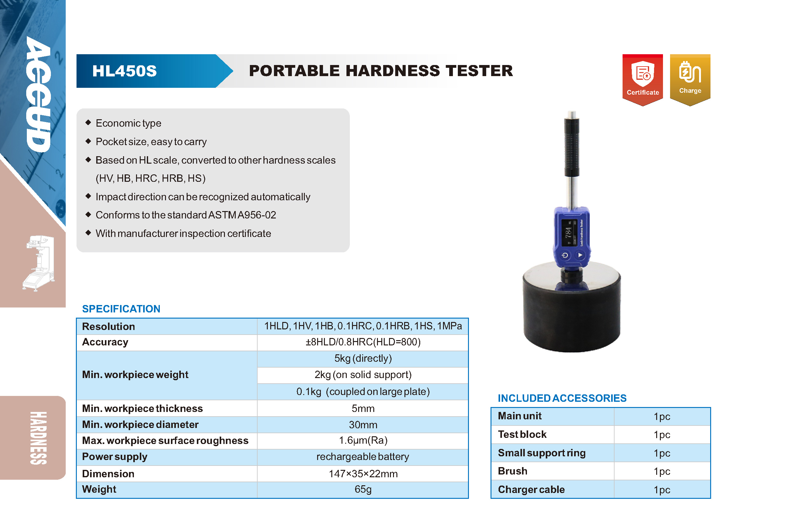 ■ Pocket size, easy to carry ■ Based on HL scale, converted to other hardness scales (HV, HB, HRC, HRB, HS) ■ Impact direction can be recognized automatically ■ Conforms to the standard ASTM A956-02 ■ With manufacturer inspection certificate