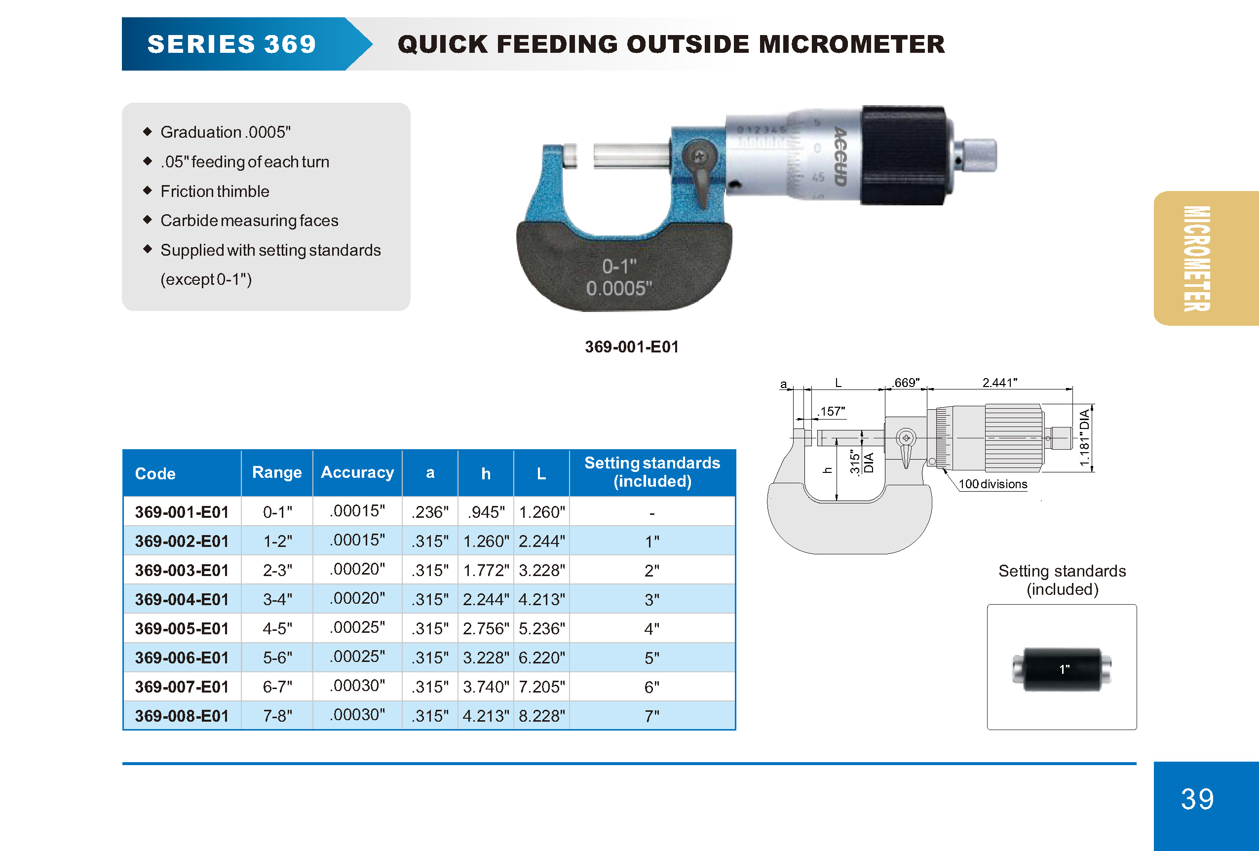 ■ Graduation .0005″ ■ .05″ feeding of each turn ■ Friction thimble ■ Carbide measuring faces ■ Supplied with setting standards (except 0-1″)