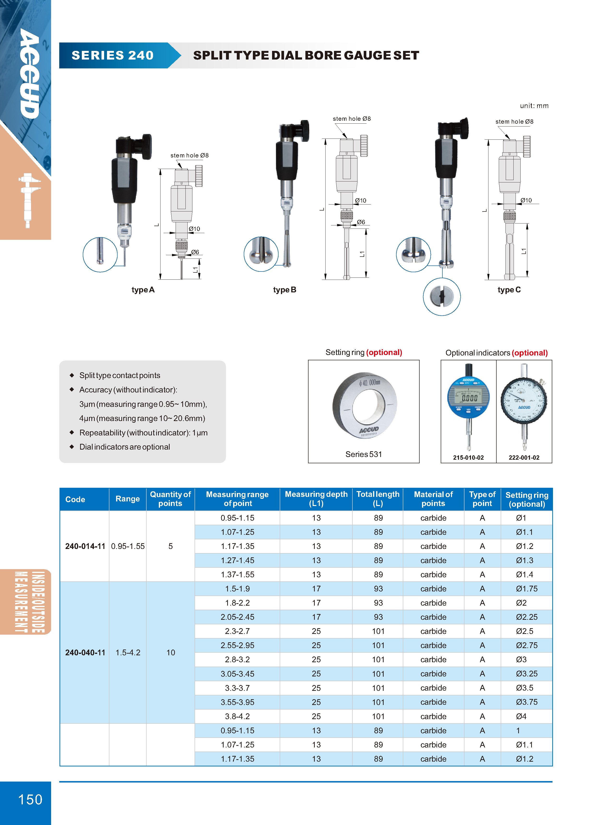 ■ Accuracy (without indicator): 3μm (measuring range 0.95~ 10mm), 4μm (measuring range 10~ 20.6mm) ■ Repeatability (without indicator): 1μm ■ Dial indicators are optional