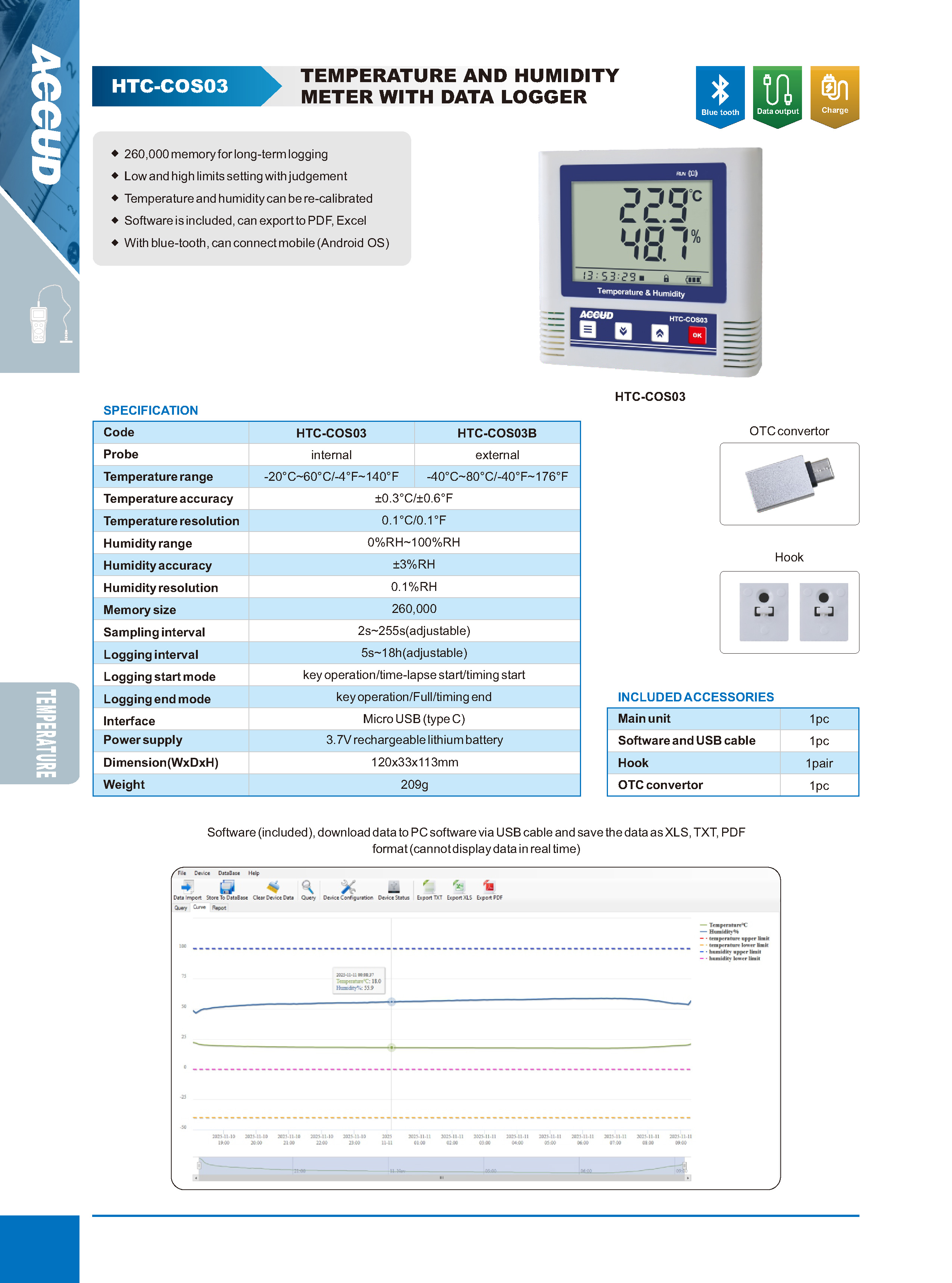 ■ Low and high limits setting with judgement ■ Temperature and humidity can be re-calibrated ■ Software is included, can export to PDF, Excel ■ With blue-tooth, can connect mobile (Android OS)